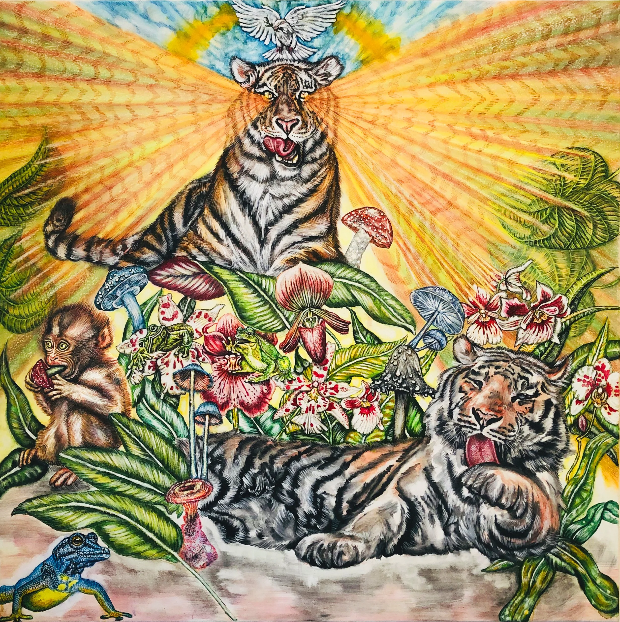 “Eye of the Tiger” explores the seductive tension between extremes. Radiant beams draw the viewer toward a central figure whose playful expression masks an undercurrent of control. Around them, creatures linger in a lush, hallucinatory landscape—both captivated and unsettled, as if unsure whether they are being protected… or quietly manipulated. The work mirrors the slow blur between illusion and truth, invitation and influence. What first appears warm and magnetic gradually reveals shifting boundaries, distorted signals, and the subtle power of a gaze that always watches back.